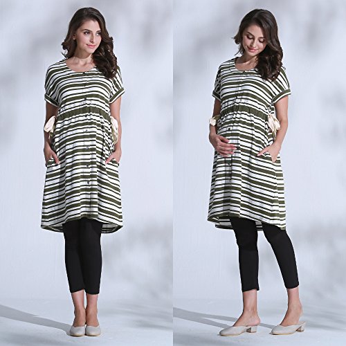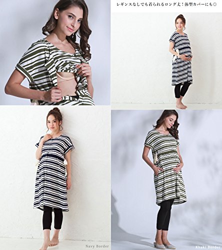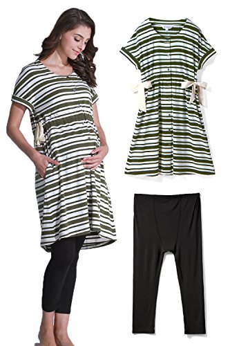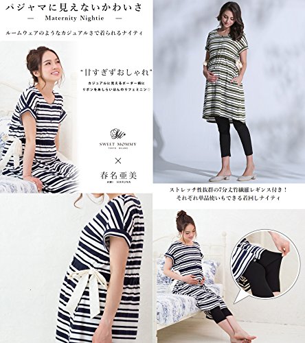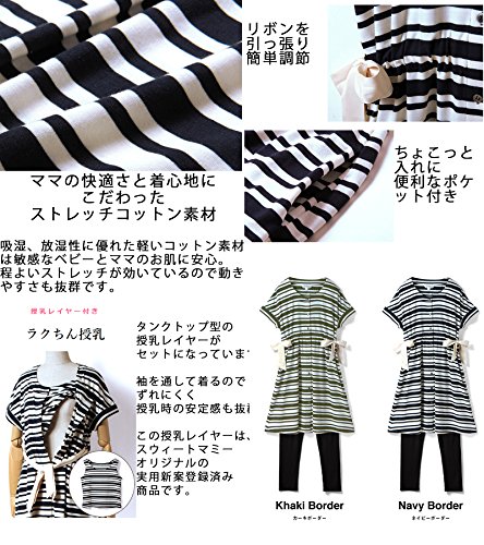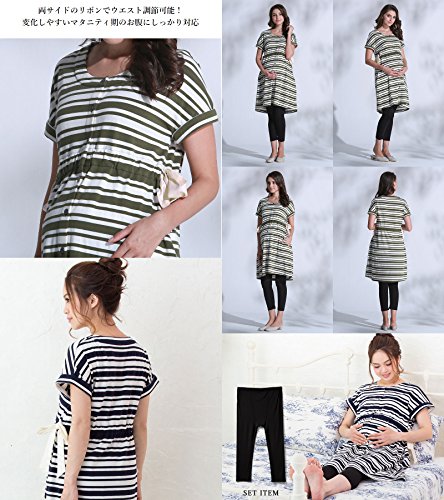 Sweet Mommy ボーダードルマン ナイティ 竹繊維レギンス付き 上下パジャマ 授乳レイヤー 3点セット やわらかコットン ウエスト調節機能 ワンピース リボン 半袖 前開き ポケット付き 入院準備 ルームウェア 産前産後 授乳服 マタニティ/カーキボーダー/M