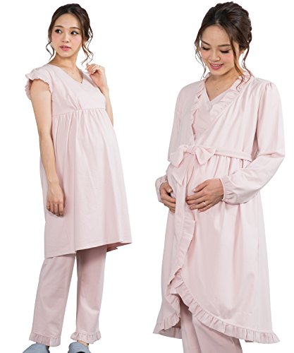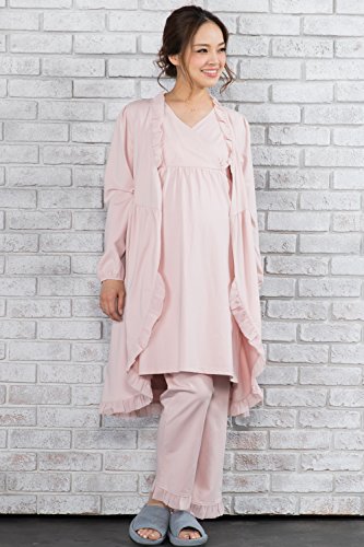 Sweet Mommy マタニティパジャマ 3点セット 授乳口付き フリルワンピ マタニティボトム ガウン ソフトカップ付き コットン 大きいサイズ 胸パッド付 春 夏 産前産後 ルームウェア ナイティ 授乳服/ピンク/M