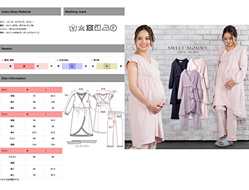 - サイズ(cm): [ガウン]M(肩幅35,着丈98,袖丈58), L(36.5,100,59) [ワンピ]M(肩幅36,着丈88,袖丈10.5,バスト84,腹囲116), L(36.5,90,10.5,88,122) [パンツ]M(ウエスト80,腹囲-100,股下66,股上30), L(84,-104,67.5,30.5)