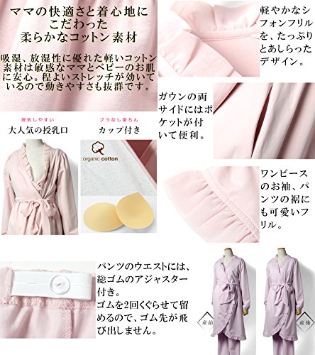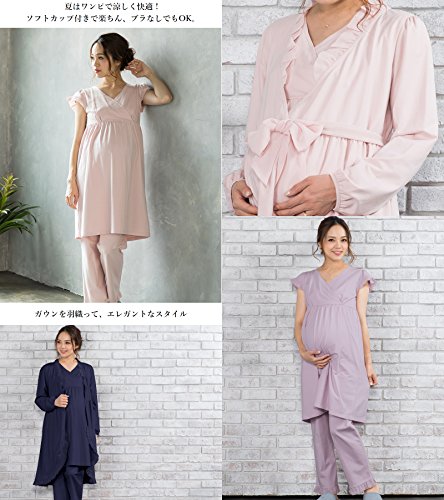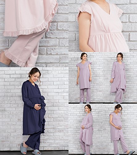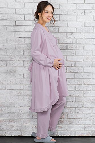 Sweet Mommy マタニティパジャマ 3点セット 授乳口付き フリルワンピ マタニティボトム ガウン ソフトカップ付き コットン 大きいサイズ 胸パッド付 春 夏 産前産後 ルームウェア ナイティ 授乳服/ライラック/L