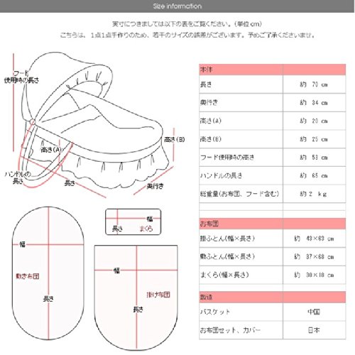 - サイズ(cm):【本体】長さ 約70, 奥行 約34, フード使用時の高さ 約53, ハンドルの長さ 約65, 総重量(お布団、フード含む) 約2㎏