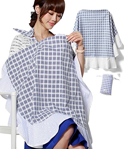 Sweet Mommy 授乳ケープ 大判 日本製ソフトワイヤー入り 360度安心 春夏カラーはコットンレースフリル 秋冬カラーはコットン裏地 ポーチ付き ナーシングケープ ギフトにも 意匠登録済み ブルーチェック