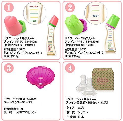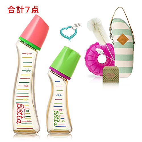 【セット内容】 1,PPSU製 ブレイン S3-240ml 2,PPSU製 ブレイン S3-120ml 3,ブレイン乳首(丸穴2個入) 4,ロートフラワー(ローズピンク) 5,専用ブラシセット 6,保温ポーチ 7,ドクターベッタ哺乳びん 専用ハートピン 【套装内容(共6件)】 1,智能PPSU树脂X型S3-240ml 2,智能PPSU树脂X型S3-120ml 3,智能O型奶嘴2枚盒装 4,玫瑰粉色漏斗 5,betta专用马毛瓶刷2件套 6,奶瓶保温套(随机,7色可选,请留言备注) 7,通奶针