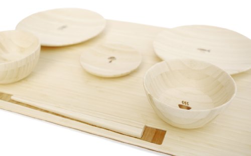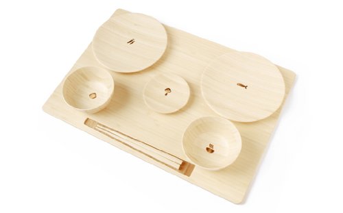 ファンファン 卓膳セット "みんなと一緒" 子供の栄養バランスを簡単に。 和食の基本、一汁三菜は栄養バランスに優れ、子供にとっては理想の食事です。一汁三菜という会席の基本に加え、箱膳という日本で古くから伝わるテーブルセッティングをモダンをにアレンジしています。主菜・副菜・副々菜・飯・汁(英語表記)を表し、作る側も食べる側も楽しく、アイコンが導いてくれます。さらに子供だけでなく大人も使えるようにと。トレーはそのまま。お皿の大きさを変えるだけで、子供から大人まで、家族みんなで、ご使用していただけます。竹の特性が活かされた食器はとても軽く、お食い初めから握力の弱いご高齢の方までみんなで一緒に使えます。 お奨め年齢:お食い初め〜 箱膳とは 箱膳は明治以降、ちゃぶ台が普及するまで日本の家庭で使われていました。特徴は家族一人一人が自分の食器セットをもつこと。これは「残さず食べること」そして、「自分で後片付けをすること」を意味し、「食べること」を通じて、自立を幼少期から学んでいったのです。