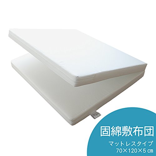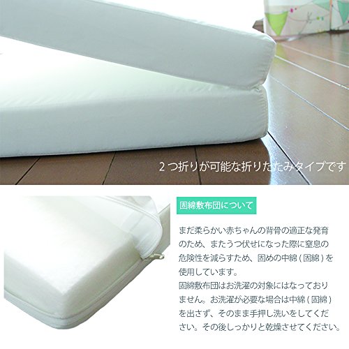 2つにたためて収納に便利なベビー用の固綿敷布団です。 日本製で安心です。 こちらのベビー固綿敷布団には 同サイズの敷フィットシーツをご使用下さい。 弊社取扱いのお昼寝布団用敷カバーはご使用いただけません。