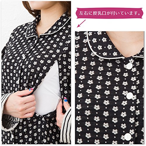 授乳口付きの長袖マタニティ パジャマです。産院からの指定の「前開き」「ロング丈」仕様。パンツのウエスト調整機能もあり妊娠中から産院への入院、産後の授乳期までずっとご使用いただけます。