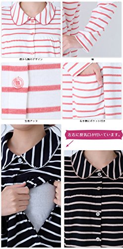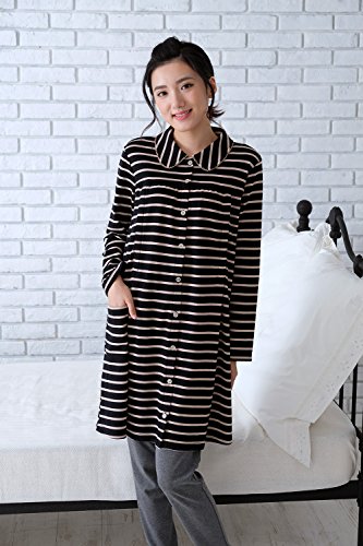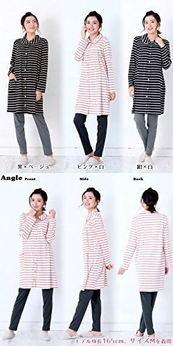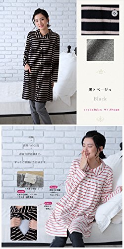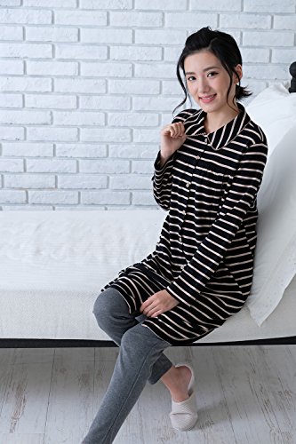 前開きマタニティ パジャマ スムース先染めボーダー/秋冬〜春/長袖 マタニティ パジャマ 前開き 入院にも/授乳口付き・長袖・前開き・パンツにはアジャスター付き・ロング丈・レディース マタニティ (黒, M)