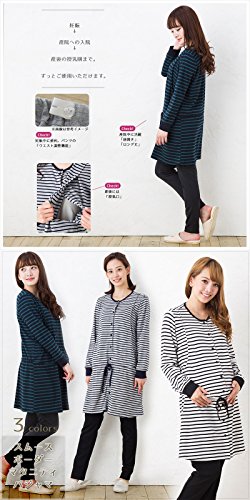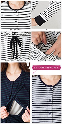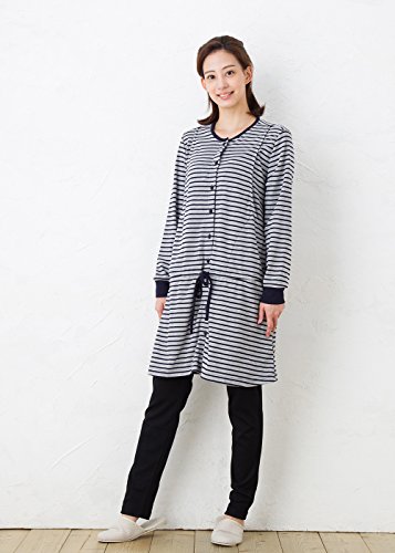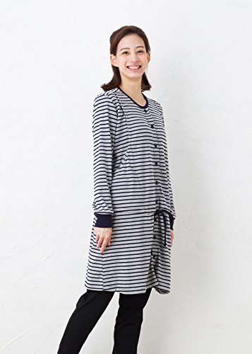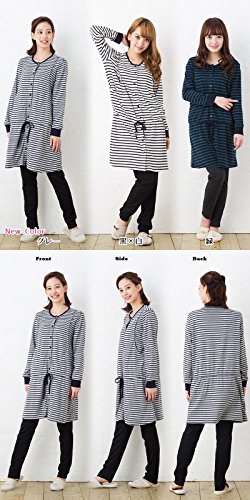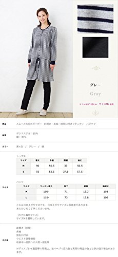前開きマタニティ パジャマ スムース先染めボーダー/秋冬〜春/長袖 マタニティ パジャマ 前開き 入院にも/授乳口付き・長袖・前開き・パンツにはアジャスター付き・ロング丈・レディース マタニティ パジャマ (L, グレー)