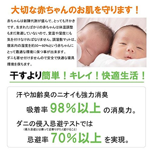 ふとんの湿気をとって、いつもカラッと! 赤ちゃんは新陳代謝が盛んでとっても汗かきです。 ダニやカビの発生はアレルギーやアトピーの原因にもなり、デリケートな赤ちゃんのお肌の天敵です! 生まれたばかりですと、体温調整もまだ発達していないので、室温や湿度にも気を付けなければなりません。 赤ちゃんの睡眠時間は一日に16~20時間。 ダニ除け調湿敷マットは、寝床内の湿度を約50~60%という赤ちゃんにとって最適な環境に保つことが出来ます。 汚れてもお洗濯で清潔に保つことが出来ますので安心です。安全な日本製