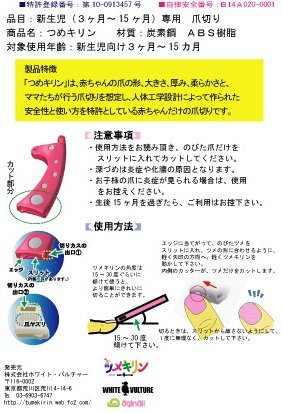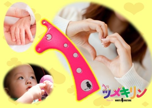 海外でも実績のある「ツメキリン」は、育児作業で、不安のひとつ、赤ちゃんの爪のお手入れを、道具と方法の両面を見直すことで、今までにないお手入れ方法を提案した製品です。今までの道具が全て、赤ちゃんの爪に合わせて大人用のものを小さくして使うという考えから、どうしても大人の大きな手から小さい手指に刃のあるものを使う不安がありました。「ツメキリン」は、親が子供(自分以外)の爪を切る場合を改めて想定し、刃を隠し、深爪と指に合った丸く安全な形状に仕上がるよう配慮した道具です。そのため、赤ちゃんのある成長時期だけを対象に絞り、機能面・安全面を重視して人体設計工学者により開発されました。道具と使い方では特許を、また、安全面では自律安全規格KCマークを取得しております。