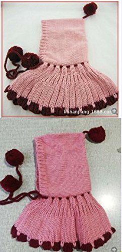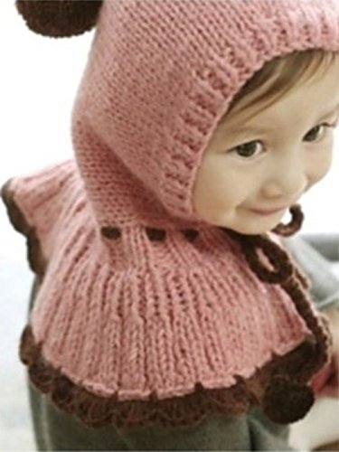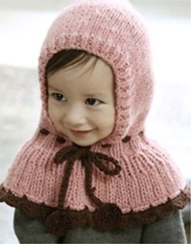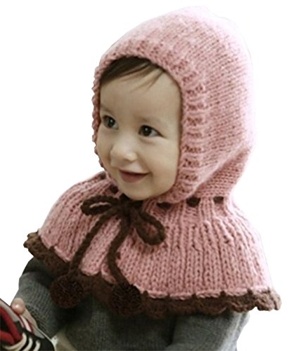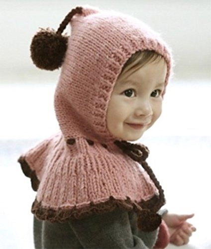 【Ludus Felix】 赤ずきんちゃん風 ニット帽 ニット帽子 ポンチョ ベビー & キッズ 子供 ボンボン付き 選べるカラー 2色 ケープ 一体型 マフラー ネックウォーマー フード 【肩&耳まであたたか】【白ステッチがかわいい】 (ピンク)