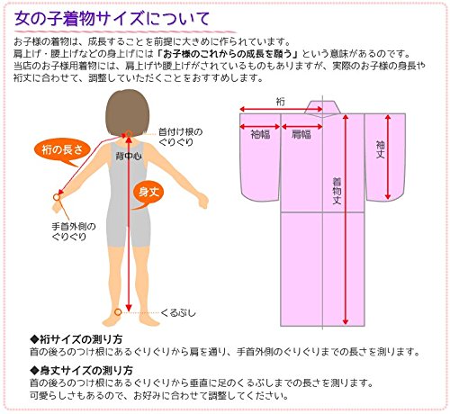- 目安の身長:80cm前後/着物丈:60cm(腰上げ前70cm)/裄:35.5cm(肩上前41cm)/袖丈:35cm/被布コート:39cm/靴下:9~11cm/※商品により多少前後します。
