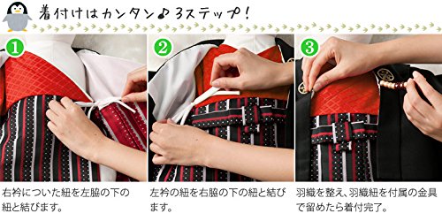 - 【着付け方】赤ちゃん用肌着のように、羽織と着物と袴が一体で前あわせになっているので、サイドの紐を結び、ビーズ羽織紐をひっかけるだけであっという間に着付け完了♪