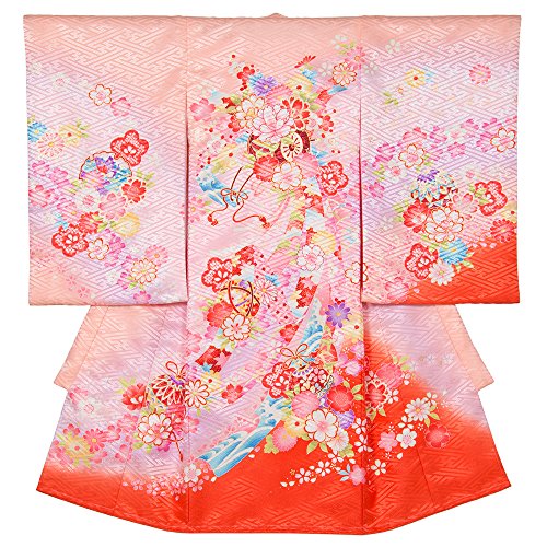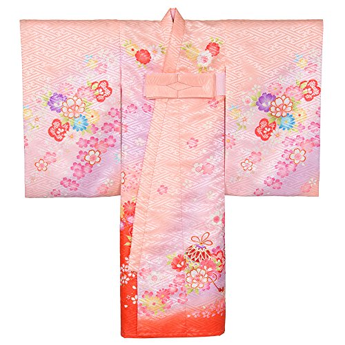 女の子初着 お宮参り着物 ポリエステル サーモンピンク 花車