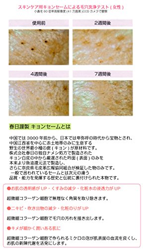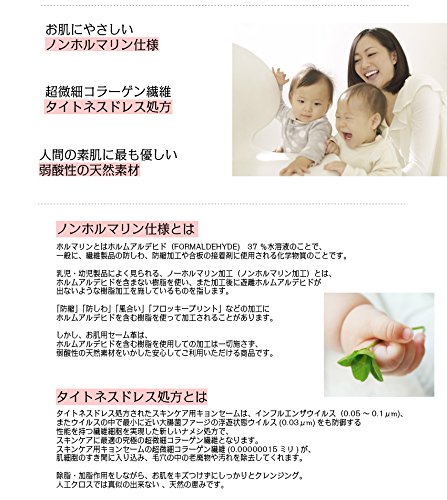 【ノンホルマリン仕様とは】ホルマリンとはホルムアルデヒド37 %水溶液のことで、一般に、繊維製品の防しわ、防縮加工や合板の接着剤に使用される化学物質のことです。乳児・幼児製品によく見られる、ノンホルマリン加工とは、ホルムアルデヒドを含まない樹脂を使い、また加工後に遊離ホルムアルデヒドが出ないような樹脂加工を施しているものを指します。「防縮」「防しわ」「風合い」「フロッキープリント」などの加工にホルムアルデヒドを含む樹脂を使って加工されることがあります。しかし、お肌用セーム革は、ホルムアルデヒドを含む樹脂を使用しての加工は一切施さず、弱酸性の天然素材をいかした安心してご利用いただける商品です。【タイトネスドレス処方とは】タイトネスドレス処方されたスキンケア用キョンセームは、インフルエンザウイルス(0.05~0.1μm)、またウイルスの中で最小に近い大腸菌ファージの浮遊状態ウイルス(0.03μm)をも防御する性能を持つ繊維細胞を実現した新しいナメシ処方で、スキンケアに最適の究極の超微細コラーゲン繊維となります。 スキンケア用キョンセームの超微細コラーゲン繊維(0.00000015ミリ)が、肌細胞のすき間に入り込み、毛穴の中の老廃物や汚れを除去してくれます。除脂・加脂作用をしながら、お肌をキズつけずにしっかりとクレンジング。人工クロスでは真似の出来ない 、天然の恵みです。【春日謹製 キョンセームとは】株式会社春日の独自ナメシ処方で製造されたキョン白皮の中から厳選された吟面(表面)のみを本来より魚油還元法で製造し、さらに奈良県毛皮革広報協同組合が検証した物のみです。