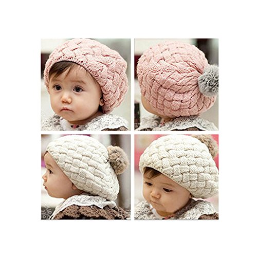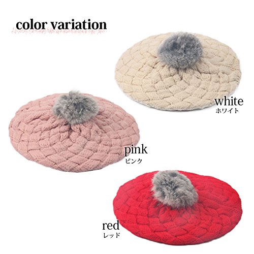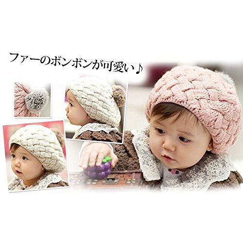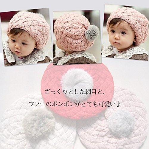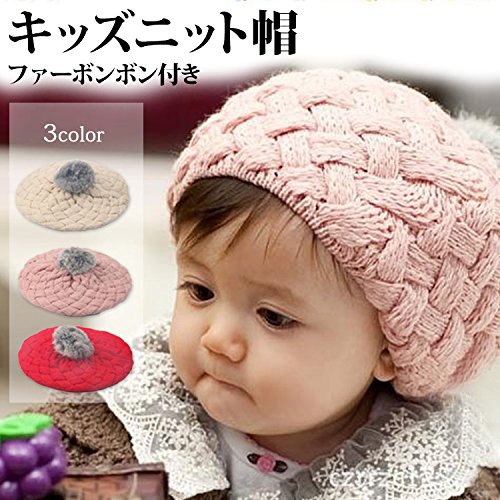ファーボンボン付きキッズニット帽 キッズ ニット帽 かわいい 子ども 帽子 ざっくり編み 可愛い プレゼント ベビー キャップ 冬 防寒 暖かい ファー ボンボン ベレー帽 3color (ピンク)