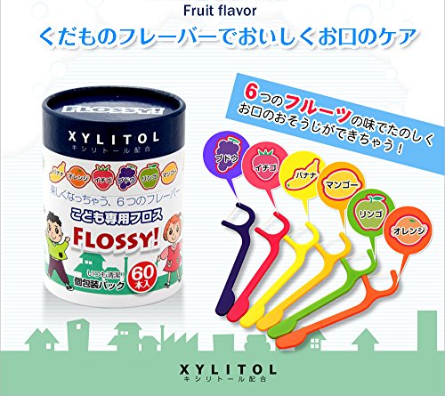 - フロスは6種類(バナナ・オレンジ・いちご・ぶどう・リンゴ・マンゴー)のフレーバーでお子さまも楽しくケア♪衛生的な個包装パック。
