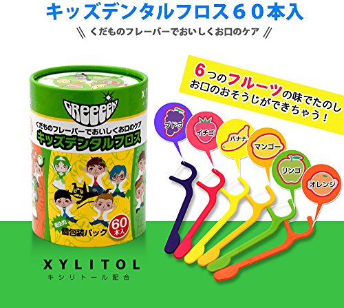 - キッズデンタルフロス…こどもの歯に合わせたスモールサイズフロス。6つのくだものフレーバー。清潔な個包装パック。