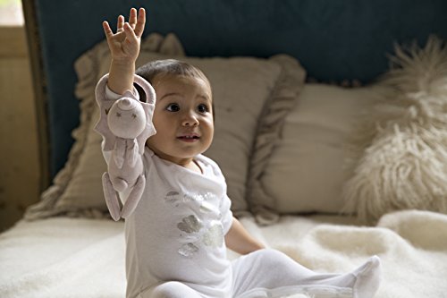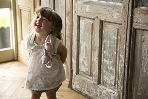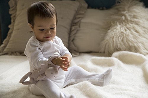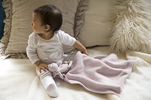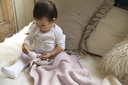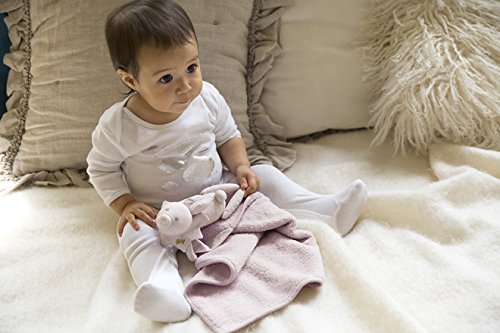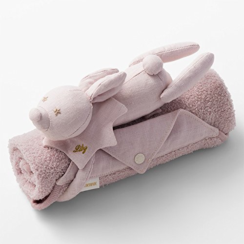 赤ちゃんのそばにいつも寄り添う「はじめてのお友だち」になれたら…。そんな思いから生まれた、愛らしいうさぎのぬいぐるみ付きの小さめブランケット。 ぬいぐるみは、ドットボタンで取り外しが可能です。中に鈴が入っているのでガラガラとしても使えて、お腹にあるパーツを使ってベビーカーへ取り付ければ、安心してお出かけのお供にできます。大きくなったら、バッグに付けても。 親しみを持って接してもらえるよう、うさぎさんを"Lily"と名付け、名前刺しゅう入りのスタイを付けました。赤ちゃんとおそろいにすれば、愛着がさらに増しそうです。 テラリウムをイメージしたオリジナルのクリアボックス入りで、プレゼントにもぴったり。