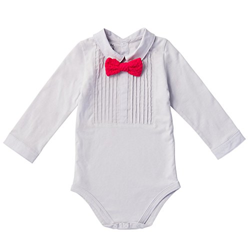 ピンタックに蝶ネクタイが付いた、ジェントルマンなボディが登場しました。 マールマールのブルマと合わせるだけで、おめかしスタイルが完成。 蝶ネクタイは2点のスナップ留めで、簡単に取り外し可能です。外すと、スタイとの相性もぴったり。合わせやすいグレー地で、さまざまなコーディネートに重宝します。 股下のスナップで、お着替えやおむつ替えもらくちん。 微起毛したコットン素材を使用し、ママもうっとりしてしまう肌ざわりです。70cm、80cmの2サイズ展開。