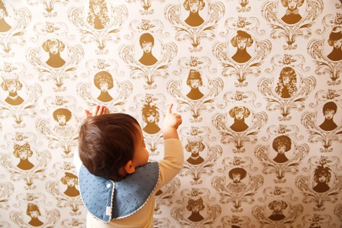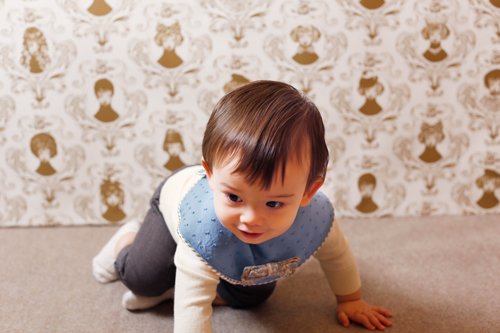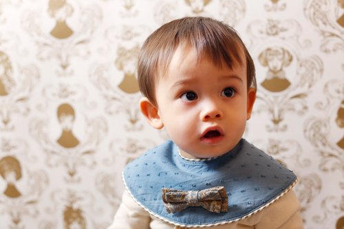 取り外し可能な、ペイズリー柄のチョウネクタイ風リボンが大人っぽいスタイです。ベースのガーゼは落ち着いた色味を使用し、品よく仕上げています。また、肌触りもよく、デリケートな赤ちゃんのお肌も安心の素材です。カジュアルなTシャツにも、上品なジャケットにも活躍してくれること間違いなしです。