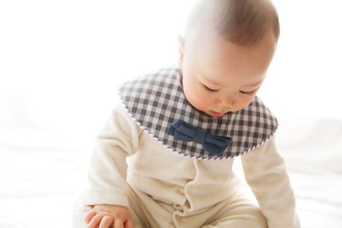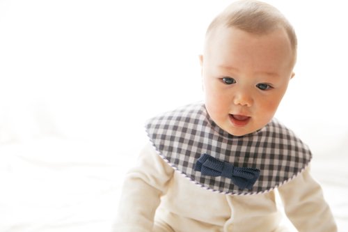 チョウネクタイ風リボンがついて、シックなコーディネートにぴったりのスタイです。落ち着いた色合いなので、シンプルなTシャツスタイルもかっこよく決まります。くるくる回ってもどこでもよだれからお洋服も守ってくれるので安心です。機能も見た目も兼ね揃えた今までにないスタイです。