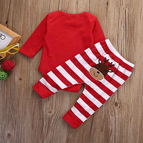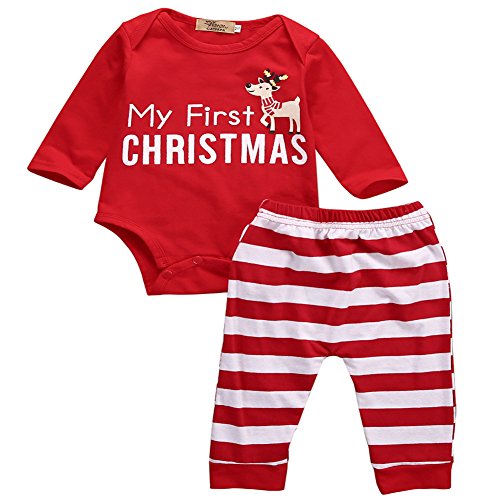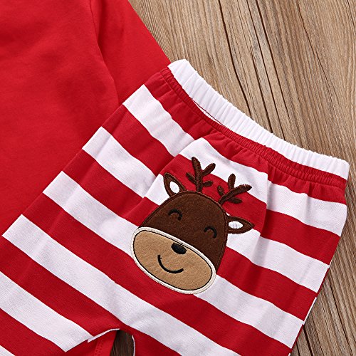 ベビー 子供服 長袖 綿 ロンパース ロングパンツ 2点セット 縞模様 トナカイ プリント 可愛い 赤ちゃん 新生児 出産祝い 普段着 (90)