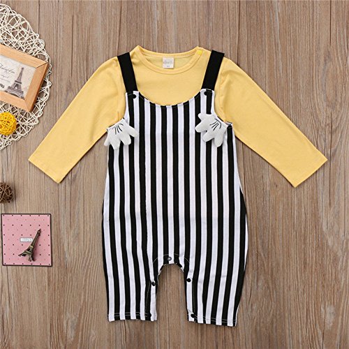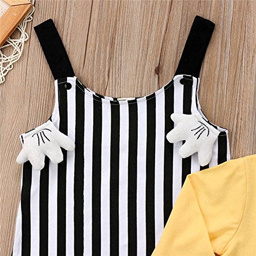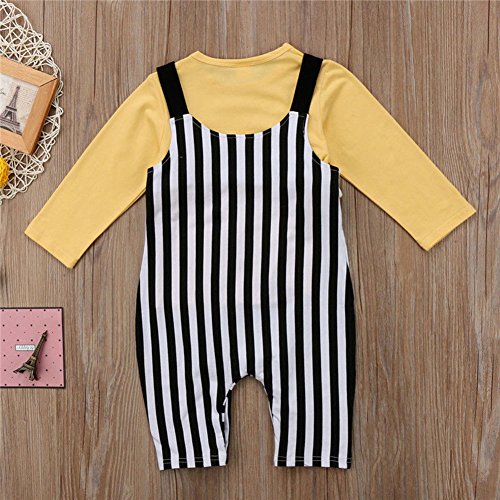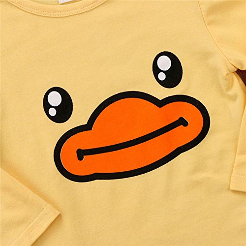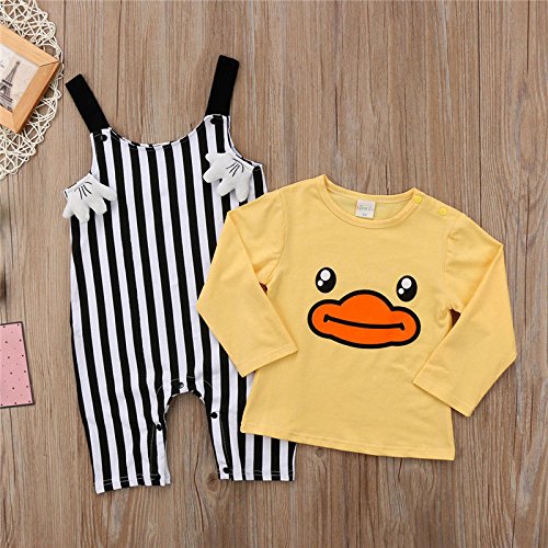 ベビー 子供服 女の子 男の子 綿 長袖 Tシャツ + サロペット 2点セット  ストライプ アヒルプリント 超可愛い 柔らかい キッズ 赤ちゃん服 サスペンダーパンツ 出産祝い 記念日 普段着 (100)