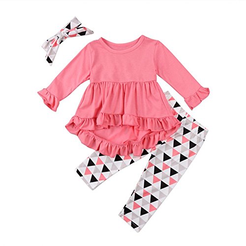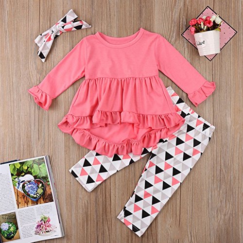子供服 女の子 長袖 フリル Tシャツ ロングパンツ ヘッドバンド 三角形柄 3点セット 裾スカラップ 可愛い 春秋冬 ガールズ服 旅行 カジュアル プレゼント (100)