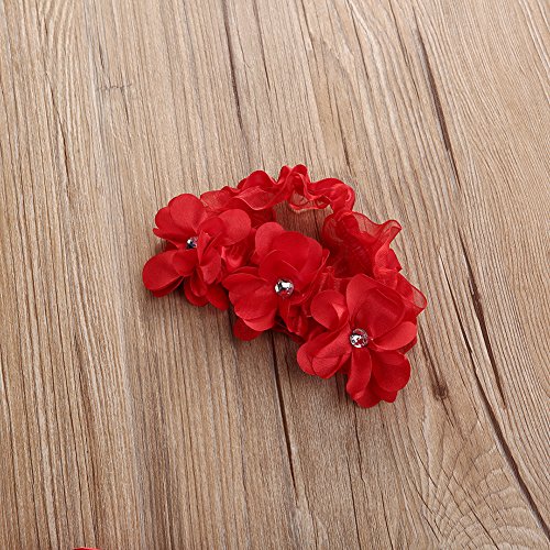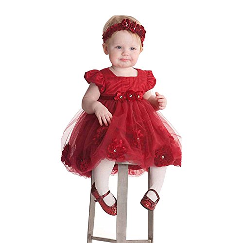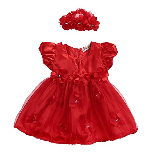 ベビー 子供服 女の子 ワンピース 赤い花のスカート レースドレス チュールスカート ヘッドバンド 2点セット フォーマルドレス 結婚式 お誕生日 出産祝い (100)