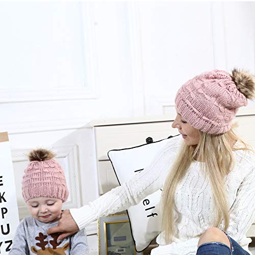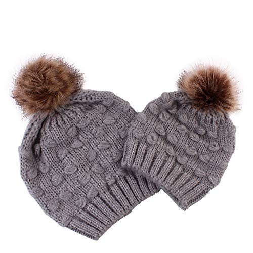 森の日和親子キャップ ニット帽 大人 子供 2点セット フェイク ファー ポンポン付き 帽子 無地 厚手 保温 (グレー)