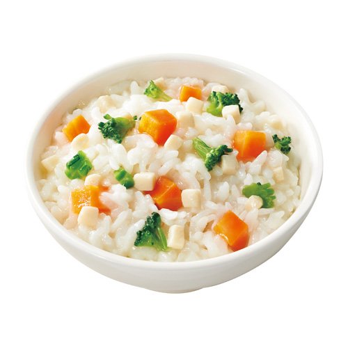- 原材料:野菜(たまねぎ、にんじん、ブロッコリー)、精白米(国産)、豆腐、コーンスターチ、クリーム、砂糖、ミルクカルシウム、チキンエキス、食塩、酵母エキス、豆腐用凝固剤、ピロリン酸鉄 【アレルギー物質(27品目中)】乳、大豆、鶏肉