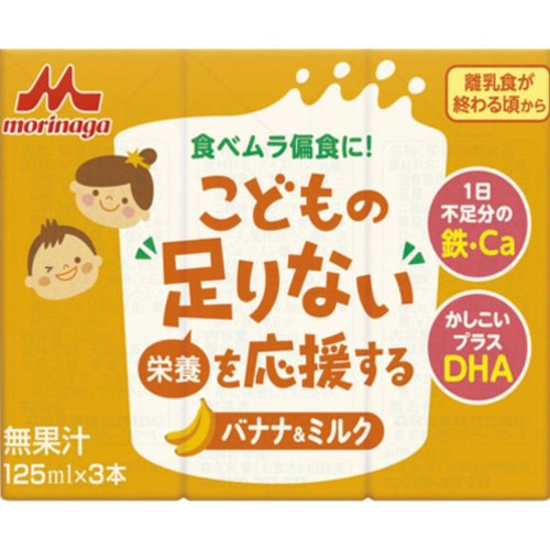 ●【商品説明】●「こどもの足りない栄養を応援する バナナ&ミルク 125ml×3本」は、「鉄・カルシウム」と「DHA」を、本品1本でおいしく手軽に補う子供用栄養ドリンクです。●お子様の食べムラ・偏食に。●離乳食が終わる頃から。●バナナ&ミルク味。●無果汁。●【お問い合わせ先】●森永乳業「お客さま相談室」フリーダイヤル:0120-303-633●製造者森永乳業株式会社東京都港区芝5-33-1●【原材料名・栄養成分等】●名称:栄養調整食品●原材料名:デキストリン、乳糖、調整脂肪、乳たんぱく質、三温糖、乳製品、ガラクトオリゴ糖液糖、ラクチュロース、精製魚油、食塩、香料、セルロース、乳化剤、リン酸K、炭酸Ca、クエン酸、塩化K、塩化Mg、クチナシ色素、V.C、炭酸K、ピロリン酸鉄、V.E、ナイアシン、V.D、パントテン酸Ca、V.A、V.B6、V.B1、葉酸、V.B2、V.B12●栄養成分:1本(125ml)当たり/エネルギー 115kcal、たんぱく質 2.6g、脂質 4.6g、炭水化物 16.1g、ナトリウム 55mg、ビタミンA 86μg、ビタミンB1 0.11m...