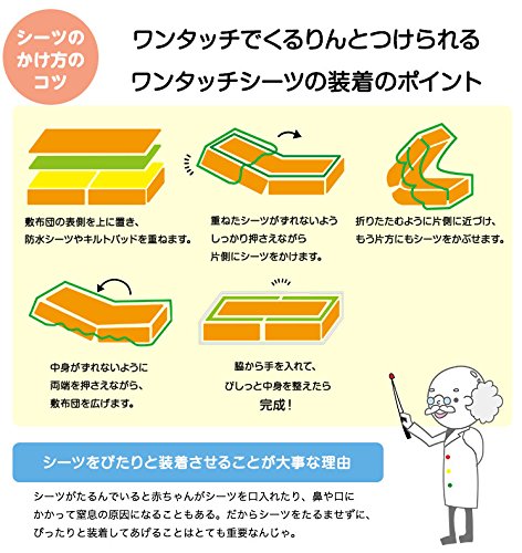 商品説明:ゴムでくるりと簡単に装着ができるワンタッチシーツです。ナチュラルな素材で安心の日本製。お洗濯にも強く、お手ごろ価格なので洗い替えにもおすすめです。