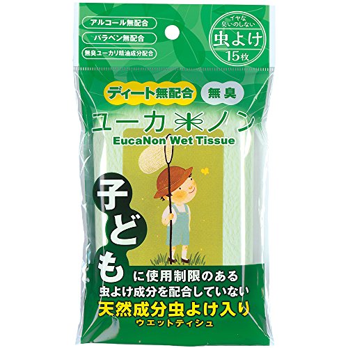 - ●「ユーカノン虫よけ入りウエットティシュ 15枚」は、子供(12歳未満)に使用制限のある虫よけ成分ディートを配合していない天然成分虫よけ入りのウェットティッシュです。