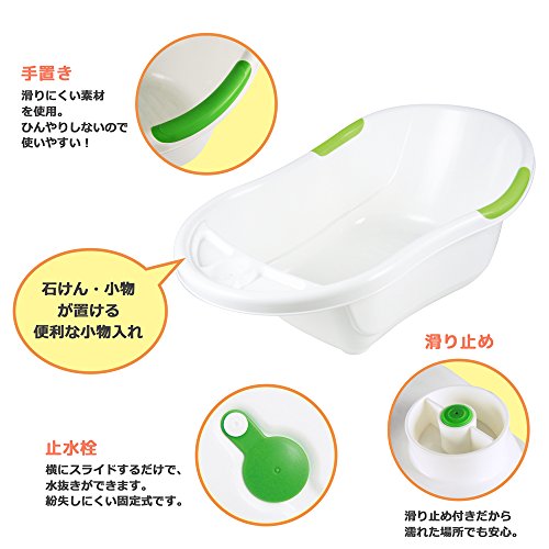 ●【商品説明】●「ベビーバスDX(グリーン)」は、ゆったりサイズの床置きタイプのベビーバスです。●本体底部には滑り止めが付いており、濡れた場所でも安心してお使いいただけます。●紛失しにくい固定式の止水栓にはやわらかい素材を使用し、素早く排水することができます。●小物トレーが設けてあるので石けんなどが置けて便利です。●手置き部分にはやわらかい素材を使用しており、ひんやりしないので使いやすいです。●【使用方法】●止水栓が外れないようにしっかりとセットしてお湯をためてください。●(赤ちゃんの体格に合わせて湯量を調節してあげてください)●【使用上の注意】●赤ちゃんは思わぬ動作をします。●ご使用の際は必ず保護者の方が付き添ってください。●お湯を入れたまま目を離しますと、お子様が溺れる危険性がありますので絶対におやめください。●赤ちゃんを本体に乗せたまま移動しないでください。●給湯時に、止水栓が外れないようにしっかりとセットしてください。●お風呂場やシンクなど濡れてもよい場所でご使用ください。●やむを得ずそれ以外の場所でご使用になる場合は、防水シートやマットを敷いて...
