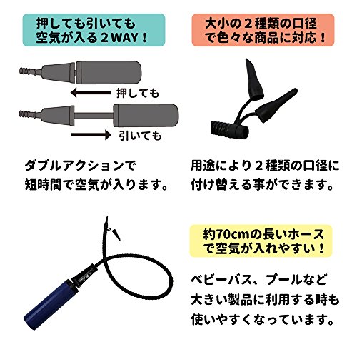 - 大小2種類のサイズのノズル付きで、色々なビニール製品の空気入れに使えます。