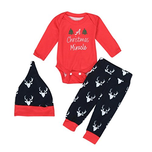 小鹿模様 3点セット(上着+パンツ+帽子) 可愛い ベビー服 女の子 幼児 赤ちゃん 新生児 子供服 男の子 出産祝い/プレゼント 4サイズ 70CM-80CM-90CM-100CM(0ヶ月-18ヶ月) (70CM/0-3ヶ月, 赤色+黒色)
