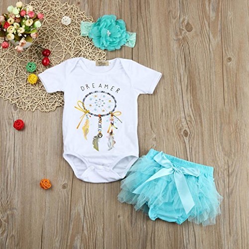 3点セット(ロンパース+スカート+ヘッドバンド)DREAMER 英語文字 かわいい ベビー服 女の子 赤ちゃん服 幼児 子供服 女の子 半袖 4サイズ 丸首 ロンパース カバーオール 満月/出産祝い/プレゼント 60CM-70CM-80CM-90CM(3ヶ月-24ヶ月) (90CM/18-24ヶ月, 写真のように)