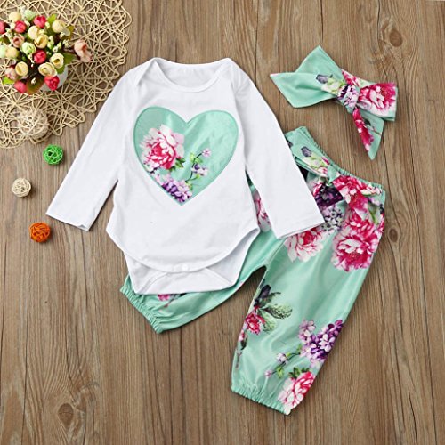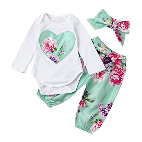 3点セット(上着+パンツ+ヘッドバンド)かわいい 花柄とハート型 ベビー服 女の子 幼児 子供服 女の子 赤ちゃん服 長袖 4サイズ キッズ服 ロンパース カバーオール 満月/出産祝い/プレゼント70CM-80CM-90CM-100CM(0ヶ月-24ヶ月) (70CM/0-6ヶ月, 写真のように)