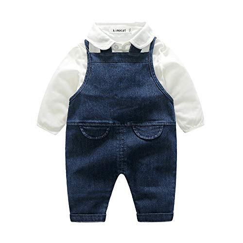 洋子ちゃん かわいい 洋子ちゃん 2点セット(上着+ズボン)男女 人気 子供 長袖 秋服白色無地ソリッドカラーシャツ+デニム オーバーオール 紳士風 スーツ 披露宴 結婚式 満月/出産祝い/プレゼント70CM-80CM-90CM-100CM (6ヶ月-3歳) (【90CM/24ヶ月】, 青色)