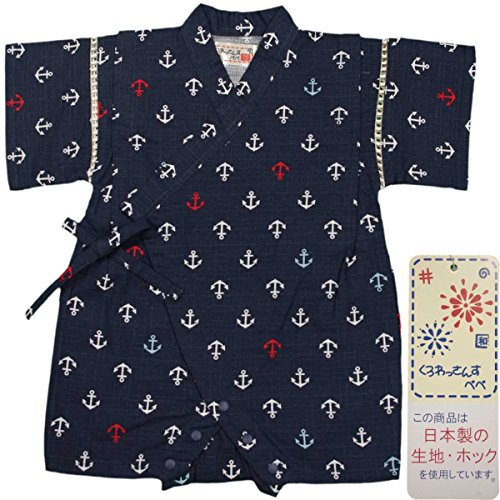 カラー : ネイビー / 男の子ベビーマリン柄・いかり柄甚平ロンパースタイプ(日本製生地使用、中国縫製) / ・ 赤ちゃんのお肌に優しい綿100%の日本製生地・ホック使用 / ・ マリン柄・いかり柄のロンパースタイプの甚平 / ・ 肩口は千鳥掛けで涼しい / ・ 上着は内掛け、外掛け紐でカンタン着用 / ・ 股下はスナップボタン留め・着脱やオムツ替えが簡単! / ・ お祭りや花火大会だけではなく、普段着やパジャマとしても大活躍! / 綿 100%(日本製生地)