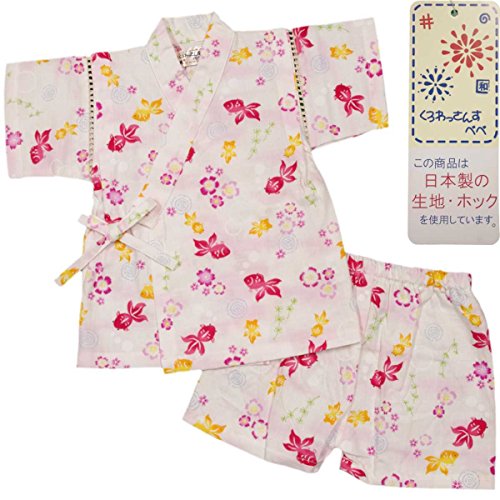 カラー : ホワイト / ガールズベビー金魚柄・和柄甚平上下セット(日本製生地使用、中国縫製) / ・ 日本製生地使用 / ・ 金魚柄・和柄の上下セパレートタイプの甚平 / ・ 肩口は千鳥掛けで涼しい / ・ 上着は内掛け、外掛け紐でカンタン着用 / ・ パンツはウェストゴム入り / ・ お祭りや花火大会だけではなく、普段着やパジャマとしても大活躍! / 綿 100%(日本製生地)
