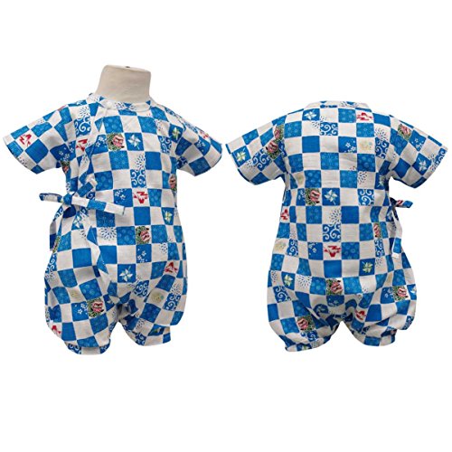 カラー : ブルー / 男の子・ベビー甚平・ロンパースタイプ・ししまい柄(日本製生地使用、中国縫製) / ・ 新生児のお肌に優しい綿100%の日本製生地・ホック使用 / ・ 和柄・ししまい柄のロンパースタイプの甚平 / ・ 内掛け、外掛け紐でカンタン着用 / ・ 股下は、スナップボタン留め・着脱やオムツ替えをしやすい / ・ お祭りや花火大会だけではなく、普段着やパジャマとしても大活躍! / 綿 100%(日本製生地)
