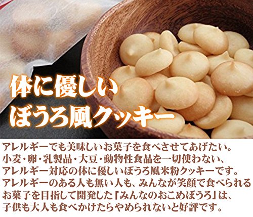 - アレルギーでも美味しいお菓子を食べさせてあげたい。小麦・卵・乳製品・大豆・動物性食品を一切使わない、アレルギー対応の体に優しいぼうろ風米粉クッキーです。アレルギーのある人も無い人も、みんなが笑顔で食べられるお菓子を目指して開発した「みんなのおこめぼうろ」は、子供も大人も食べかけたらやめられないと好評です。