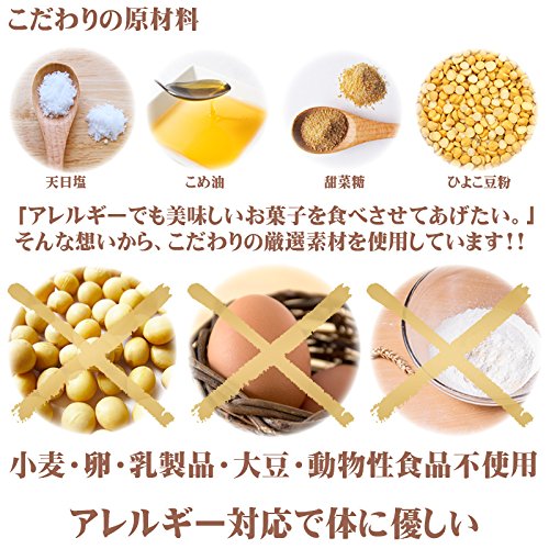 - 【原材料】 米粉(滋賀県愛荘産コシヒカリ)※滋賀県環境こだわり農産物認証、こめ油(国産)、甜菜糖(北海道産)、ひよこ豆粉、天日塩 【ご注意事項】小麦・卵・乳製品の持込禁止加工所にて製造しておりますが、まれにごく微量混入する可能性がございます。重篤なアレルギーをお持ちの方はお控ください。同加工所内では大豆・ゴマを使用した製品を製造しております。