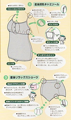 ≪産後授乳キャミソール≫ ◇胸元は授乳に便利なカシュクールオープンタイプ ◇ストラップは調節できます。 ◇取り外し可能なパット付。パッド収納部分は、洗濯時にもパッドがズレにくく、飛び出しにくい仕様です。 ◇産後専用サイズで作られているので、もたつかずにすっきりしたデザイン。 ◇しゃがんでも背中が見えないロング丈です。 ≪産後リラックスショーツ≫ ◇ウエストゴムは、肌に直接当たらず、しめつけにくい仕様です。 ◇伸縮性のある綿混素材で、抜群のフィット感♪ ◇産後すぐには元に戻らないお腹まわりにもピッタリのサイズ展開です。 ◇足口ゴムは身生地でくるんでいるので、締め付けにくく、痛くなりにくい仕様です。 ◇股裏部分は肌に優しい綿100% ☆お肌に優しいネーム外付け仕様 ☆中国製