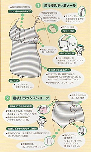 ≪産後授乳キャミソール≫ ◇胸元は授乳に便利なカシュクールオープンタイプ ◇ストラップは調節できます。 ◇取り外し可能なパット付。パッド収納部分は、洗濯時にもパッドがズレにくく、飛び出しにくい仕様です。 ◇産後専用サイズで作られているので、もたつかずにすっきりしたデザイン。 ◇しゃがんでも背中が見えないロング丈です。 ≪産後リラックスショーツ≫ ◇ウエストゴムは、肌に直接当たらず、しめつけにくい仕様です。 ◇伸縮性のある綿混素材で、抜群のフィット感♪ ◇産後すぐには元に戻らないお腹まわりにもピッタリのサイズ展開です。 ◇足口ゴムは身生地でくるんでいるので、締め付けにくく、痛くなりにくい仕様です。 ◇股裏部分は肌に優しい綿100% ☆お肌に優しいネーム外付け仕様 ☆中国製