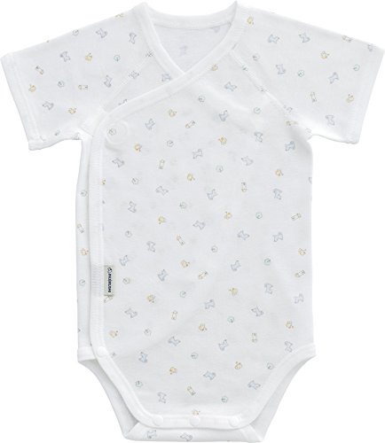 肌触りの良いフライス素材で、総柄プリントがかわいいボディミニは、外側は着脱簡単なマジックテープ(R)開きで、赤ちゃんの肌に直接縫い目が触れないよう縫い目は全て表側にしています。