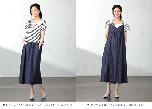 - ●【産前~産後まで使える2WAYオフショルTシャツ×デニムキャミワンピースセット】肌触りのいい天竺素材のTシャツは、オフショルデザインとフレアスリーブでフェミニンに仕上げました。セットのTシャツは肩のボタンを閉じて2通りの着こなしが楽しめます。ワンピースの胸元が授乳しやすいクロスオープンにしました。